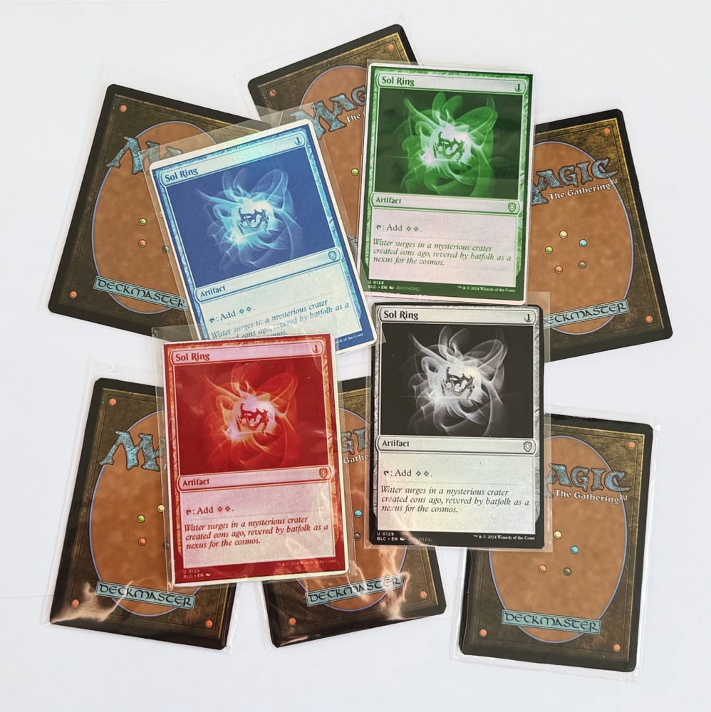 custom designed sol ring proxy’s. printed on real magic card foils that were hand scrubbed